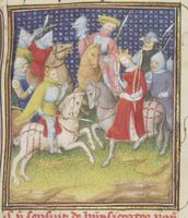 Parigi, Bibliothèque Nationale de France, Fr. 12420, f. 110r. Beronice insegue gli assassini del figlio su un carro da guerra.