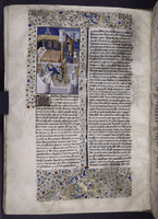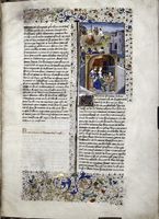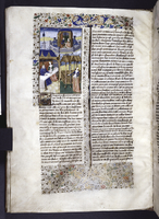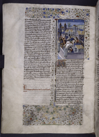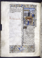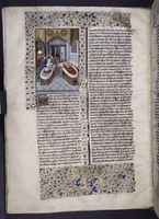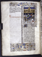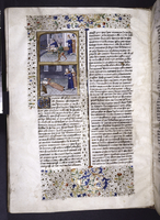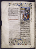 New York, Public Library, Spencer 33, f. 66v. Semiamira si prostituisce; Semiamira appare in Senato al fianco del figlio, l'imperatore Antonio (Eliogabalo); Semiamira presiede il senaculum, rappresentato da tre matrone romane; Semiamira ed Antonio vengono assassinati da due uomini.