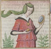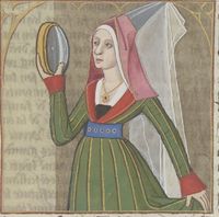 Parigi, Bibliothèque Nationale de France, Fr. 599, f. 84r. Il copista del manoscritto è Johannes Michel. L'imperatrice Faustina si guarda allo specchio.