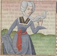 Parigi, Bibliothèque Nationale de France, Fr. 599, f. 91r. Il copista del manoscritto è Johannes Michel. Camiola appoggiata ad un bastone.