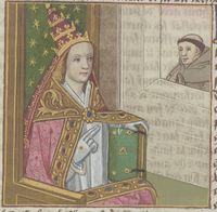 Parigi, Bibliothèque Nationale de France, Fr. 599, f. 88r. Il copista del manoscritto è Johannes Michel. La papessa Giovanna benedice un monaco.