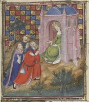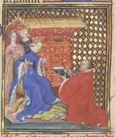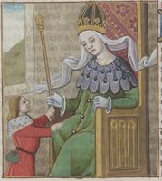 Parigi, Bibliothèque Nationale de France, Fr. 599, f. 93v. Il copista del manoscritto è Johannes Michel. La regina Giovanna I in trono si rivolge a un servitore.