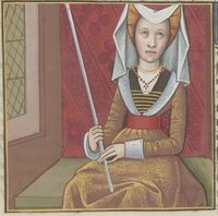 Parigi, Bibliothèque Nationale de France, Fr. 12420, f. 8r. Semiamira, regina di Babilonia, impugna le armi per guidare l'esercito mentre si volge verso il figlio Ninia.