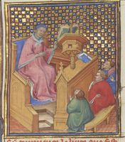 Parigi, Bibliothèque Nationale de France, Fr. 12420, f. 3r. L'autore Giovanni Boccaccio in cattedra insegna ai suoi discepoli.