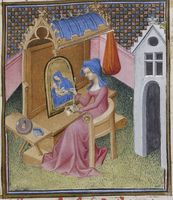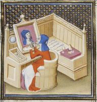 Parigi, Bibliothèque Nationale de France, Fr. 598, f. 100v. Marzia dipinge il proprio autoritratto dinanzi allo specchio.