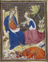 Parigi, Bibliothèque Nationale de France, Fr. 598, f. 105r. Sofonisba riceve la coppa avvelenata inviata dal marito; Sofonisba beve il veleno.