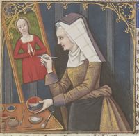 Parigi, Bibliothèque Nationale de France, Fr. 599, f. 50v. Il copista del manoscritto è Johannes Michel. Artemisia vestita a lutto.