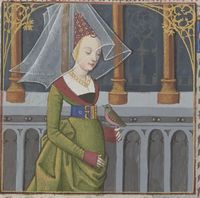 Parigi, Bibliothèque Nationale de France, Fr. 599, f. 48r. Il copista del manoscritto è Johannes Michel. Megulia Dotata con un falcone.