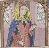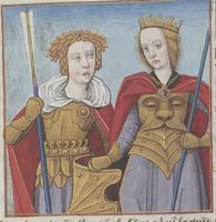 Parigi, Bibliothèque Nationale de France, Fr. 599, f. 21v. Il copista del manoscritto è Johannes Michel. La regina Giocasta con uno scettro sottile.