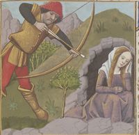 Parigi, Bibliothèque Nationale de France, Fr. 599, f. 20r. Il copista del manoscritto è Johannes Michel. Iole con una freccia tra le mani.