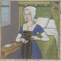 Parigi, Bibliothèque Nationale de France, Fr. 599, f. 34r. Il copista del manoscritto è Johannes Michel. Penelope, moglie di Ulisse, legge un libro.