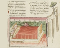 Parigi, Bibliothèque Nationale de France, It. 63, f. 148r. Il copista del manoscritto, datato 10 ottobre 1427, è Ludovico di Salvestro Ceffini. Lo spettro di Lorenzo appare a Lisabetta mentre dorme; la fanciulla piange sulla pianta di basilico.