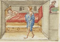 Parigi, Bibliothèque Nationale de France, It. 63, f. 155v. Il copista del manoscritto, datato 10 ottobre 1427, è Ludovico di Salvestro Ceffini. Il marito di Salvestra trova la moglie nel letto con accanto il corpo di Girolamo.
