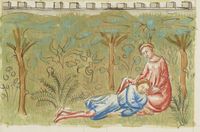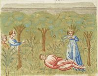 Parigi, Bibliothèque Nationale de France, It. 63, f. 165r. Il copista del manoscritto, datato 10 ottobre 1427, è Ludovico di Salvestro Ceffini. Cimone osserva Efigenia addormentata in un prato insieme ad altre fanciulle del suo seguito.
