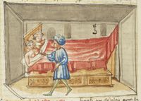 Parigi, Bibliothèque Nationale de France, It. 63, f. 175v. Il copista del manoscritto, datato 10 ottobre 1427, è Ludovico di Salvestro Ceffini. Lizio da Valbona e sua moglie scoprono la figlia a letto con il proprio amante.