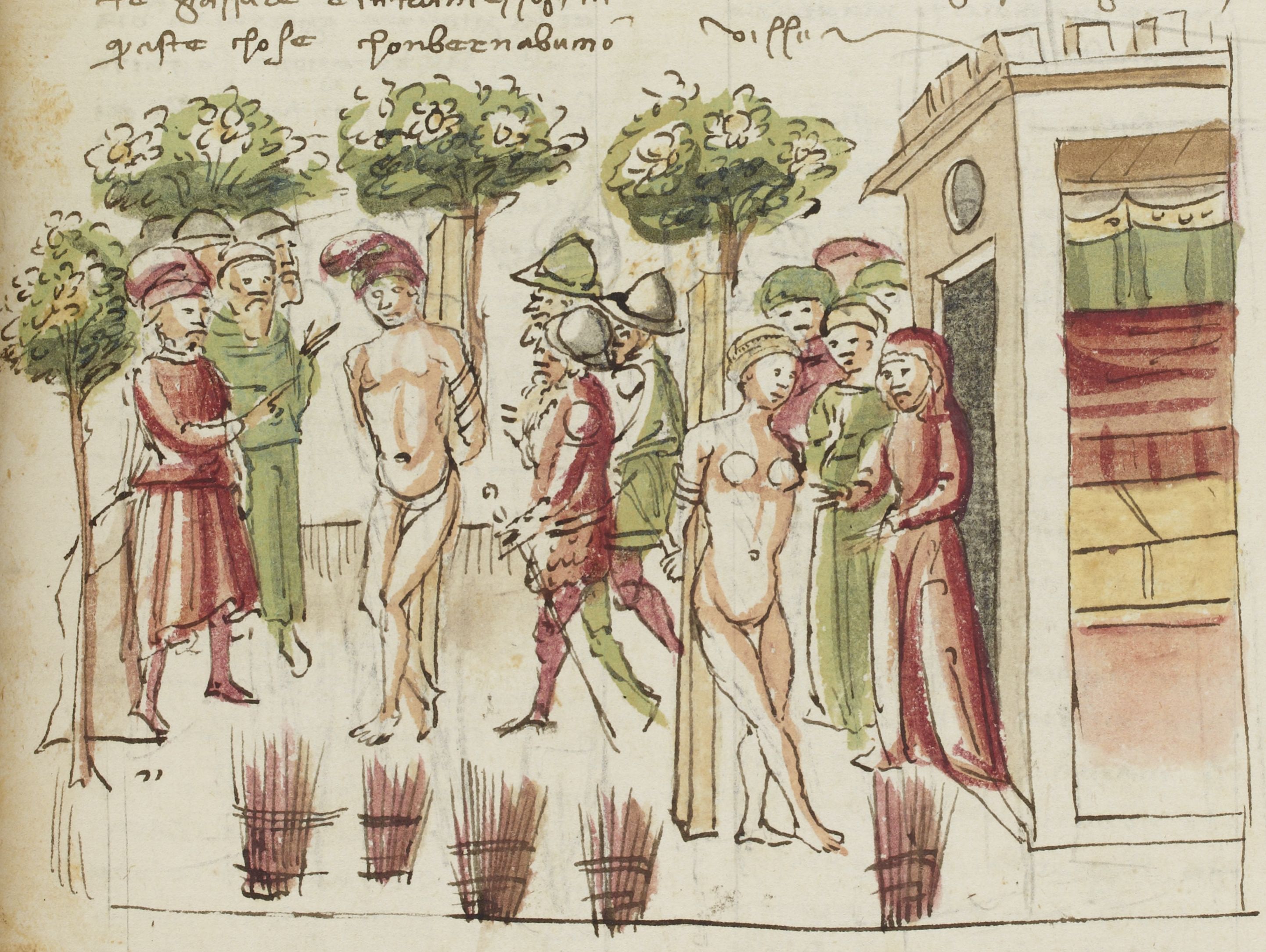 Parigi, Bibliothèque Nationale de France, It. 63, f. 181r. Il copista del manoscritto, datato 10 ottobre 1427, è Ludovico di Salvestro Ceffini. Gianni di Procida e Restituta vengono spogliati e legati a dei pali per essere bruciati vivi.