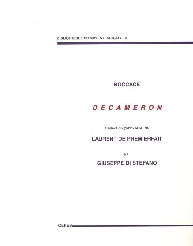 In the present volume, Giuseppe Di Stefano oners the reader a first edition of the first translation into French of the integral text of Giovanni Boccaccio's Decameron (1348-53). This monumental endeavor, having spanned a major portion of the editor's international career, contributes to the field of philology a work as important as his Dictionnaire des locutions en mcyenjrançaù (CERES, 1991) . The edition is an indispensable tool for the study of middle French idioms, as well as an invaluable document delineating Boccaccio's early diffusion and reception in France. Published under the tides of Decameron, De Cameron, Le Uwe des Cent Nouvelles de Jehan Bocace de Certald or Prince Galeot, the French translation of the Italian's popular collection of one hundred novelle was carried out by Laurent de Premierfait (d. 1418), a prominent, although understudied, late-medieval humanist.