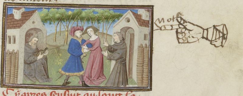 Scuola del Maestro del Duca di Bedford (1430 c.), Il monaco Rustico siede nella sua capanna; Neerbale allontana Alibech da Rustico