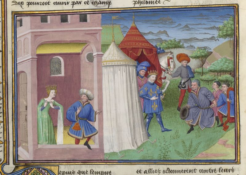 Parigi, Bibliothèque de l'Arsenal, 5070, f. 76v. Il copista del manoscritto è Guillebert de Mets. La moglie del re di Francia si strappa le vesti per accusare Gualtieri, conte d'Aversa, di averla violentata, mentre il conte stesso si dà alla fuga; il nuovo re di Francia restituisce titoli e ricchezze a Gualtieri ed ai suoi figli.