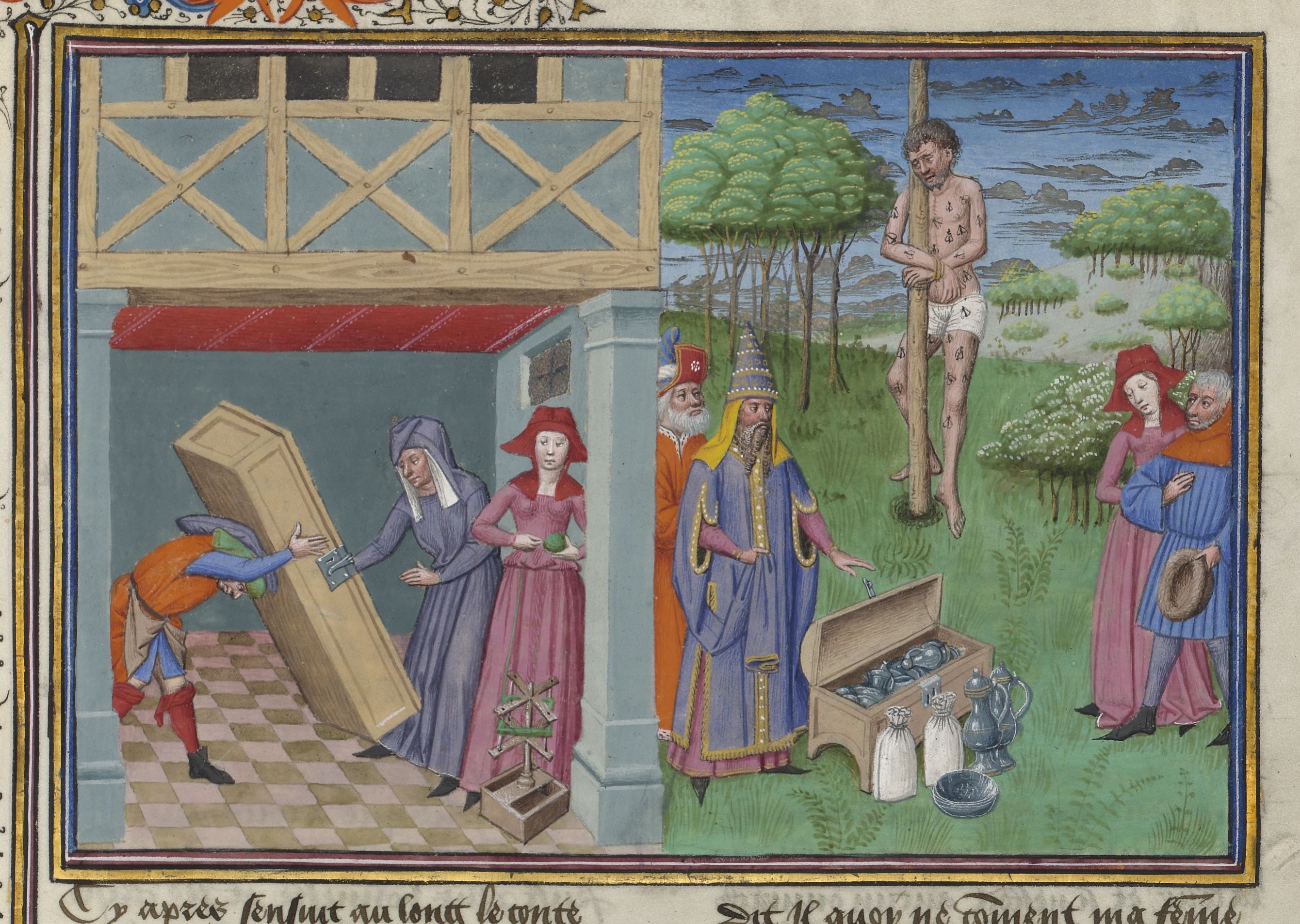 Parigi, Bibliothèque de l'Arsenal, 5070, f. 84r. Il copista del manoscritto è Guillebert de Mets. Ambrogiuolo si fa portare dentro una cassa in casa di Bernabò, dove sono sua moglie e una domestica; il Sultano di Babilonia dona molte ricchezze a Bernabò e sua moglie, mentre Ambrogiuolo per punizione viene legato nel deserto e lasciato torturare dagli insetti.