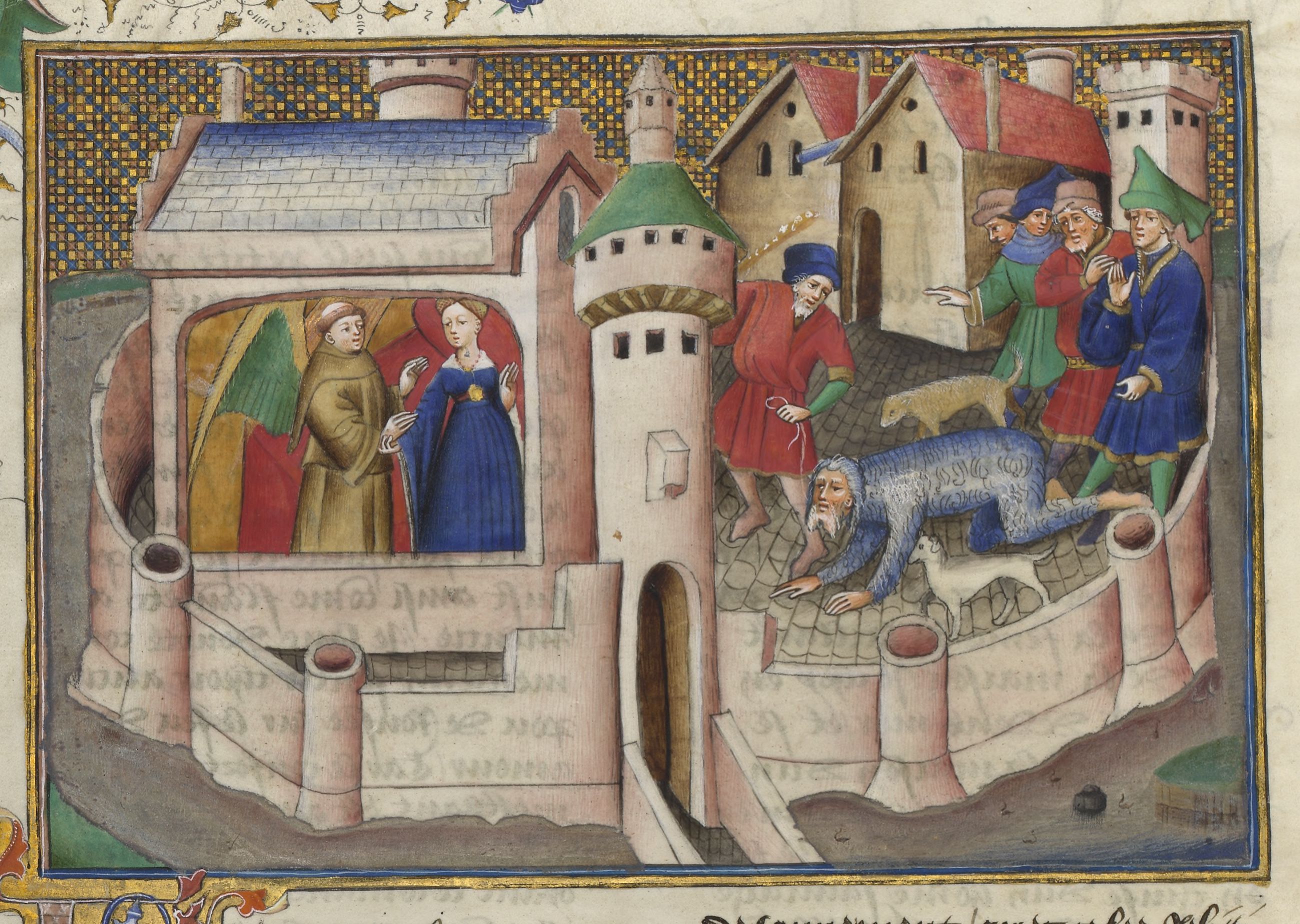Parigi, Bibliothèque de l'Arsenal, 5070, f. 150v. Il copista del manoscritto è Guillebert de Mets. Frate Alberto, travestito da angelo Gabriele, visita madonna Lisetta; Alberto, vestito da uomo selvatico, viene trascinato per strada e vituperato dalla folla.