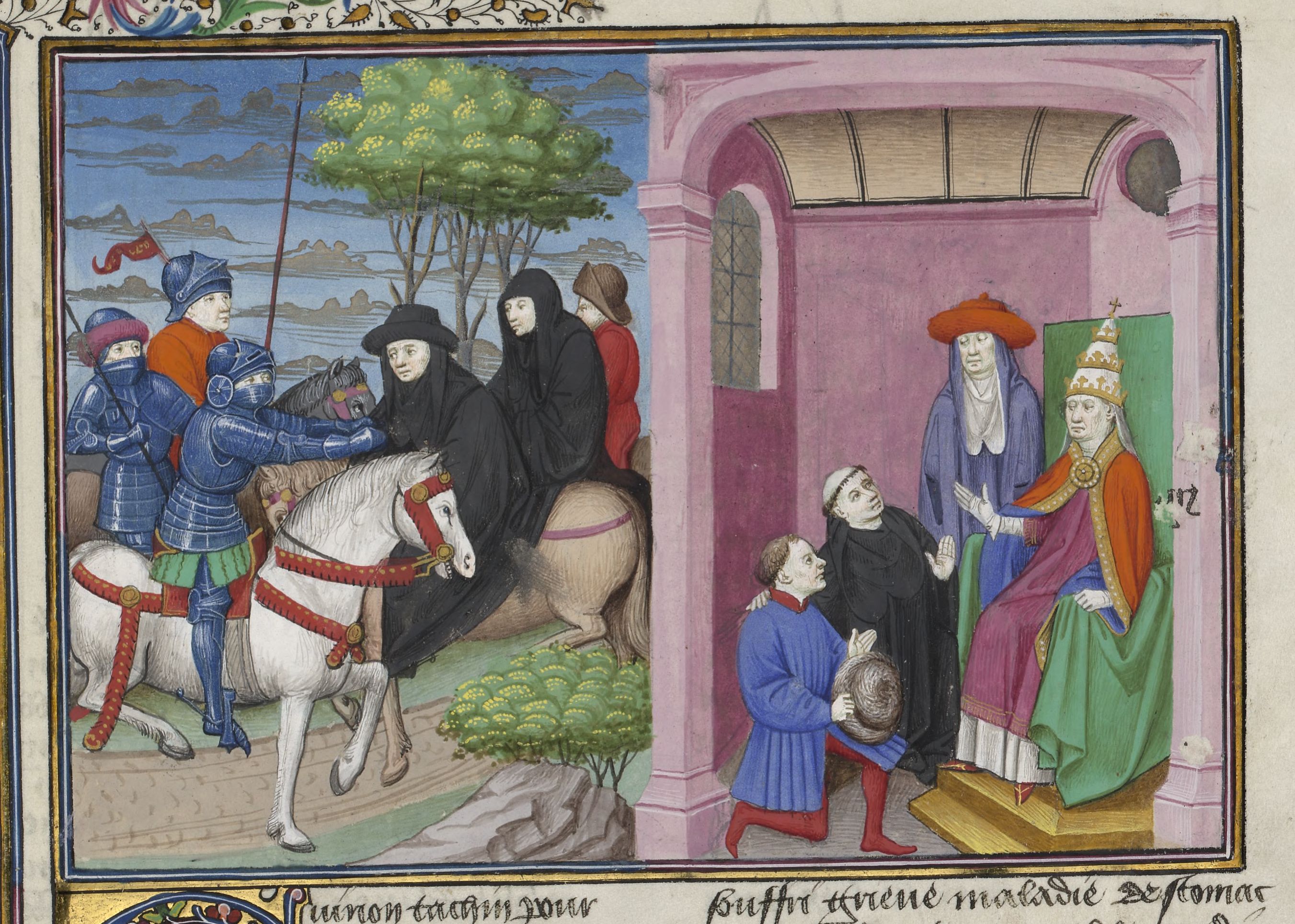 Maestro di Jean Mansel (1430-1450), Ghino di Tacco cattura l'abate di Clignì; l'abate intercede per Ghino presso il Papa