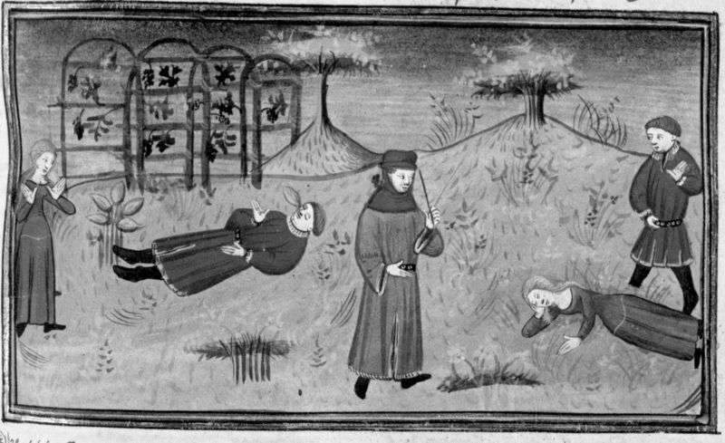 Parigi, Bibliothèque Nationale de France, Fr. 12421, f. 195r. Simona piange la morte di Pasquino, avvelenato dalla salvia; per dimostrare la propria innocenza, Simona muore anch'essa avvelenata di fronte al giudice.