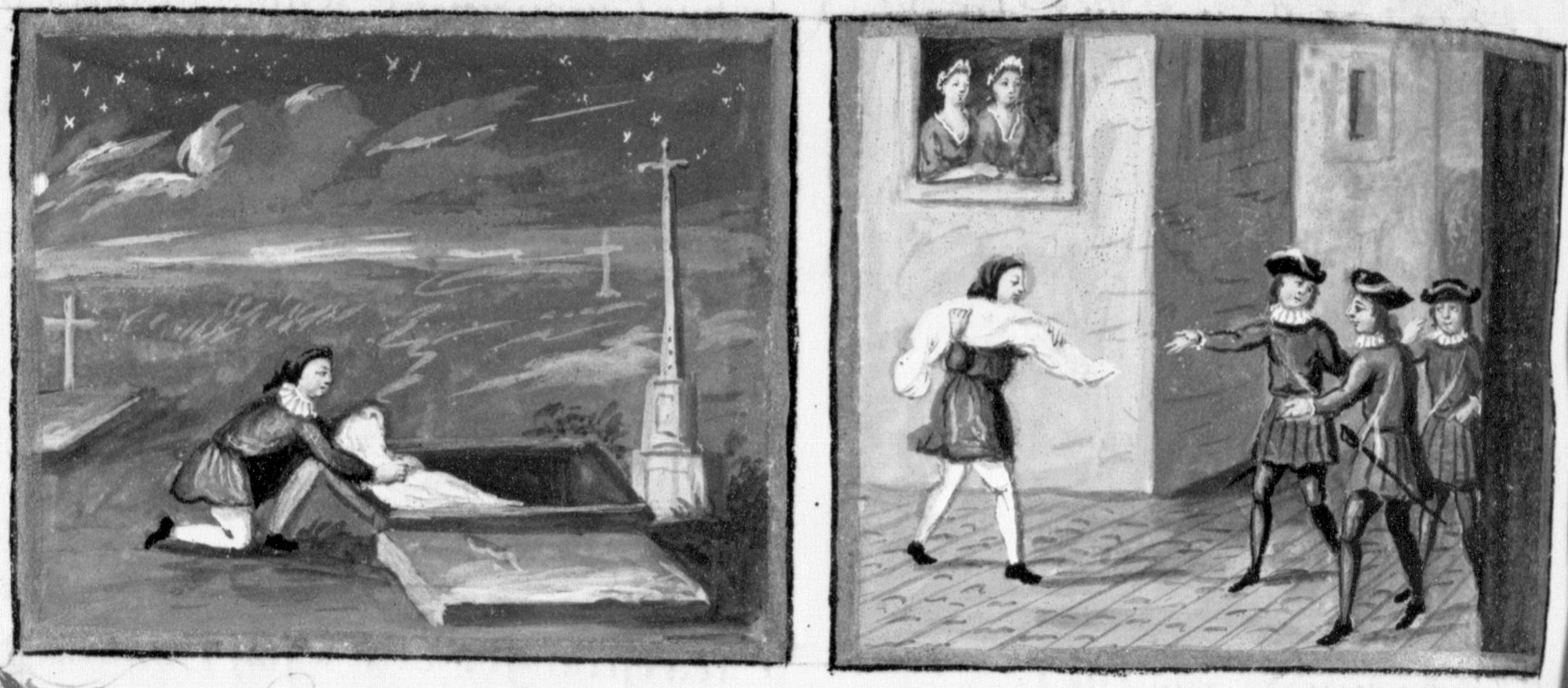 Miniatore francese (XVII secolo), Rinuccio dissotterra un cadavere; l'uomo incontra delle guardie