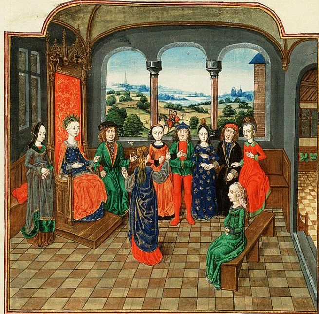 L'Aia, Koninklijke Bibliotheek, 133 A 5, f. 256r. I dieci novellatori si riuniscono intorno ad Elisa, regina della sesta giornata; sullo sfondo, madonna Oretta accetta di cavalcare con un accompagnatore.