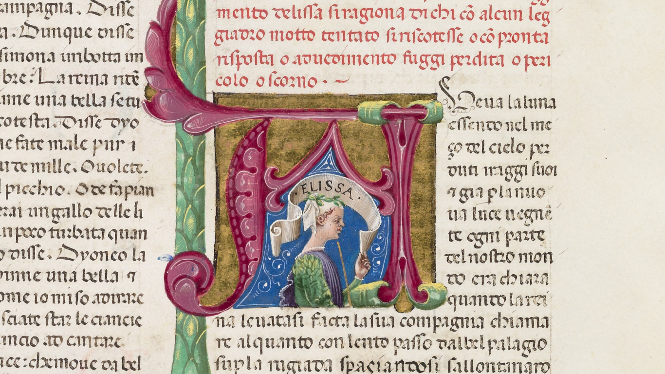 Oxford, Bodleian Library, Holkham misc. 49, f. 96v. Busto di Elissa, regina della sesta giornata, all'interno dell'iniziale figurata A(veva).