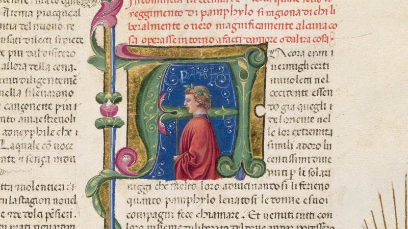 Oxford, Bodleian Library, Holkham misc. 49, f. 148r. Busto di Panfilo, re della decima giornata, all'interno dell'iniziale figurata A(ncora).