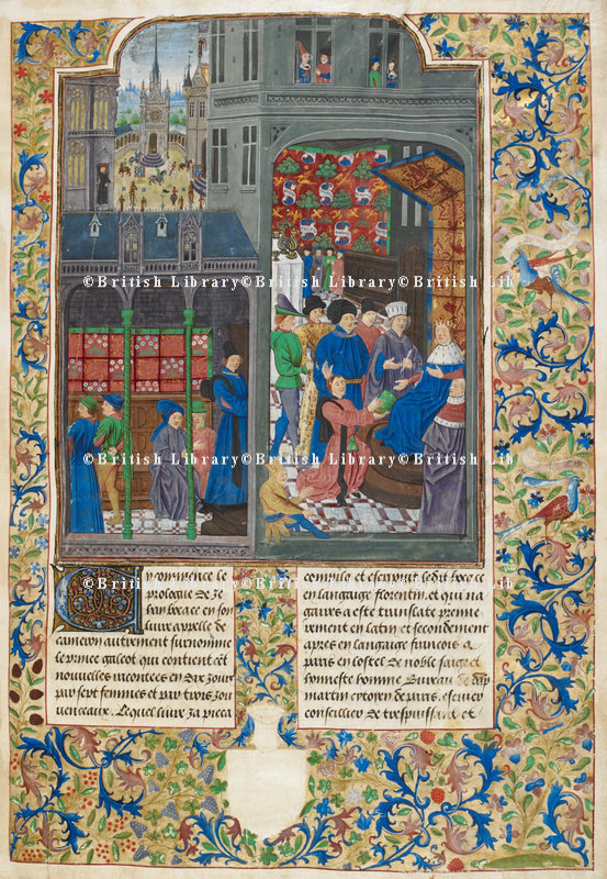 Londra, British Library, Add. 35322, f. 1r. Laurent de Premierfait presenta la sua traduzione francese del Decameron al duca Jean di Berry.