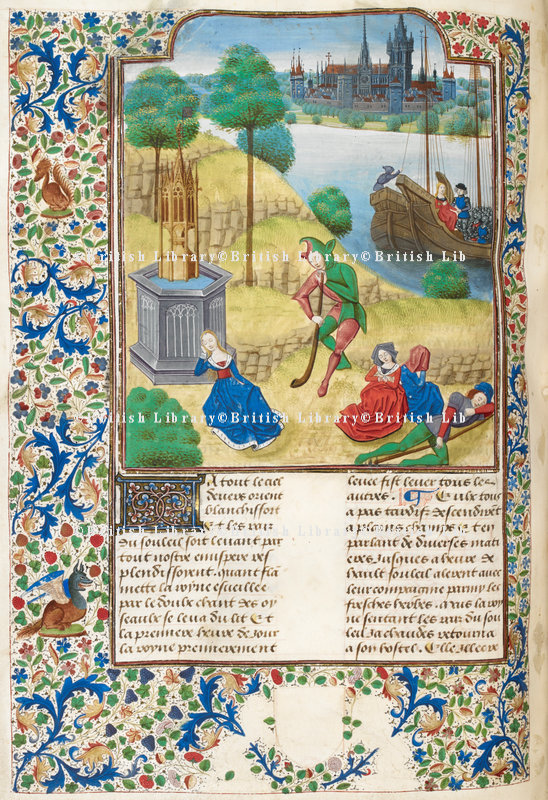 Londra, British Library, Add. 35322, f. 227v. Cimone osserva Efigenia dormire accanto ad una fontana, insieme ad alcuni compagni poco distanti; Cimone attacca la nave su cui viaggia Efigenia e rapisce la fanciulla.