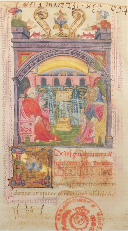 Parigi, Bibliothèque Nationale de France, Lat. 8521, f. 2r. Giovanni Boccaccio e Francesco Petrarca siedono in cattedra in uno studio, ai lati di un leggio su cui è poggiato un libro aperto; in alto si trovano due figure maschili a mezzobusto, quella a sinistra indica un cartiglio con la parola "possibile", mentre la figura sulla destra indica un cartiglio recante la scritta "impossibile".