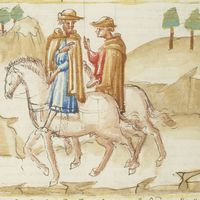 [9] Avevano in Mugello messer Forese e Giotto lor possessioni; e essendo messer Forese le sue andate a vedere, in quegli tempi di state che le ferie si celebran per le corti, e per avventura in su un cattivo ronzin da vettura venendosene, trovò il già detto Giotto, il quale similmente avendo le sue vedute se ne tornava a Firenze; il quale né in cavallo né in arnese essendo in cosa alcuna meglio di lui, sì come vecchi a pian passo venendosene insieme s’accompagnarono. [10] Avvenne, come spesso di state veggiamo avvenire, che una subita piova gli sopraprese: la quale essi, come più tosto poterono, fuggirono in casa d’un lavoratore amico e conoscente di ciascheduno di loro. [11] Ma dopo alquanto, non faccendo l’acqua alcuna vista di dover ristare e costoro volendo essere il dì a Firenze, presi dal lavoratore in prestanza due mantellacci vecchi di romagnuolo e due cappelli tutti rosi dalla vecchiezza, per ciò che migliori non v’erano, cominciarono a camminare.