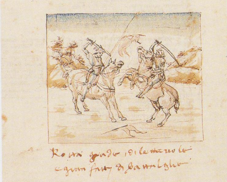 Firenze, Biblioteca Nazionale Centrale, II.II.27, f. 91v. Panto viene assalito da un cavaliere che spezza il suo vessillo.