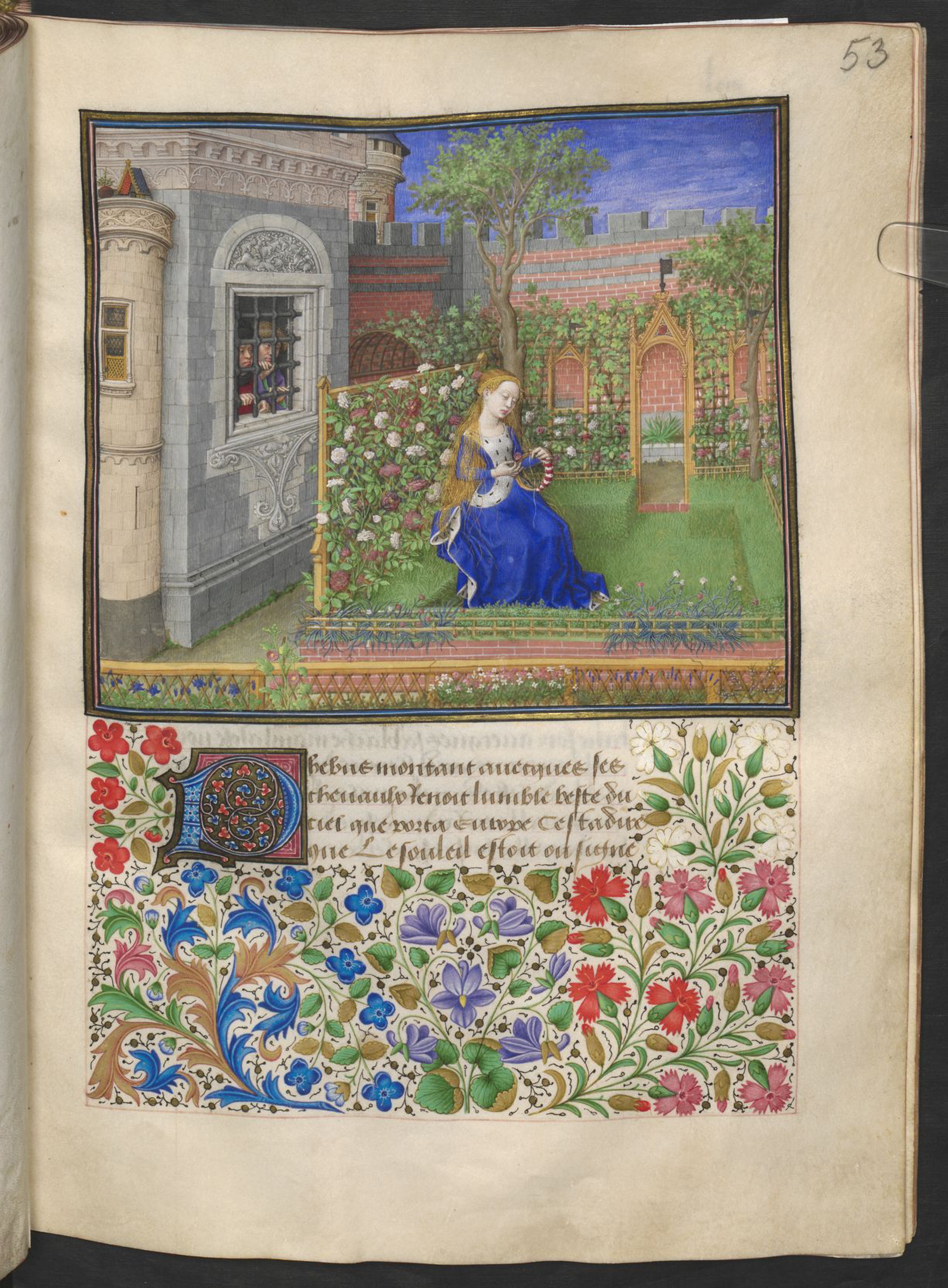Vienna, Österreichische Nationalbibliothek, 2617, f. 53r. Arcita e Palemone dalla finestra della prigione osservano Emilia mentre siede nel giardino ed intreccia una corona di fiori.