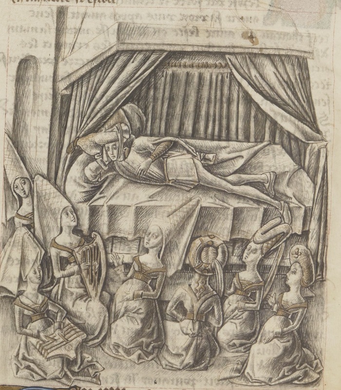Parigi, Bibliothèque Nationale de France, Fr. 25528, f. 85v. Il copista del manoscritto è Pierre d'Amboise. Un gruppo di donne troiane suona una melodia per distrarre Troiolo dalle sue sofferenze d'amore.