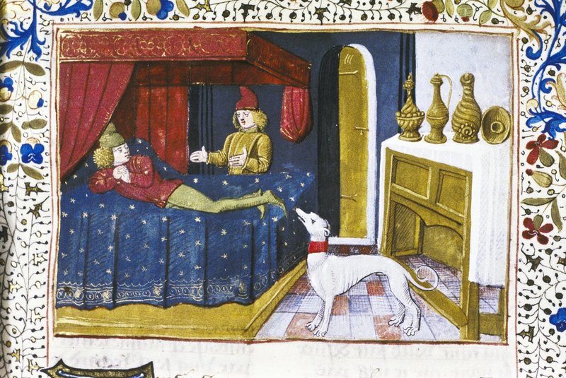 Oxford, Bodleian Library, Douce 331, f. 8r. Pandaro si reca nella stanza dell'amico Troiolo, il quale giace a letto vinto dalle sofferenze d'amore.