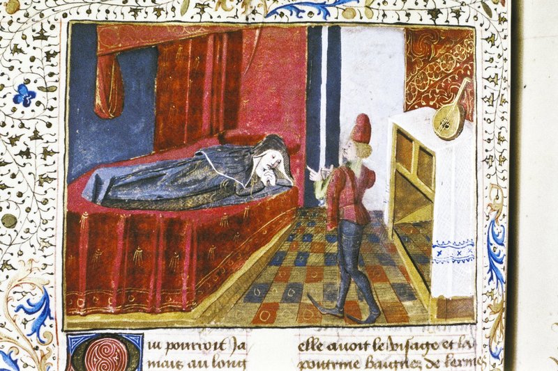 Oxford, Bodleian Library, Douce 331, f. 43v. Pandaro tenta di consolare Criseide, la quale giace a letto torcendosi le mani dal dolore.