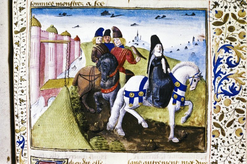 Oxford, Bodleian Library, Douce 331, f. 52r. Criseide viene riaccompagnata all'accampamento greco da una scorta a cavallo, di cui fa parte anche Troiolo con un falcone sul pugno.