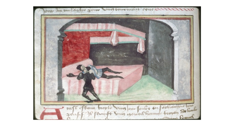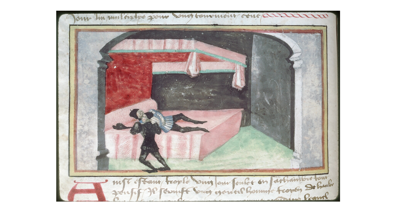 Tours, Bibliothèque Municipale, 0956, f. 6v. Pandaro tenta di consolare l'amico Troiolo, il quale giace a letto vinto dalle sofferenze d'amore.