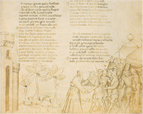 Firenze, Biblioteca Nazionale Centrale, II.II.90, f. 68r. I Greci accolgono nel loro accampamento il veggente Calcante, fuggito da Troia.