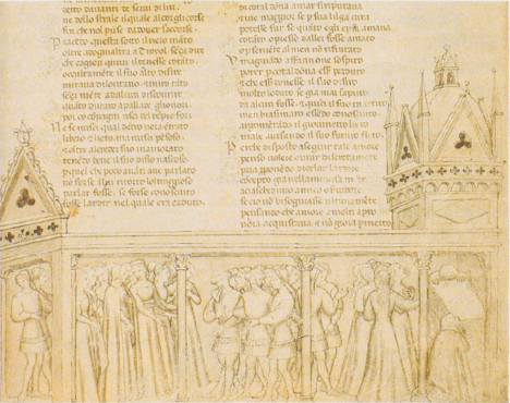 Firenze, Biblioteca Nazionale Centrale, II.II.90, f. 69r. Troiolo scorge Criseide durante una celebrazione nel tempio di Atena.