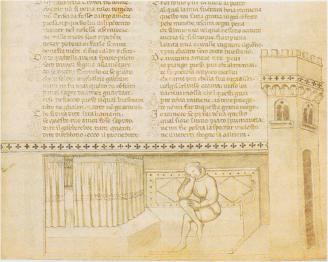 Firenze, Biblioteca Nazionale Centrale, II.II.90, f. 70r. Troiolo siede nella propria stanza in preda alle sofferenze d'amore.