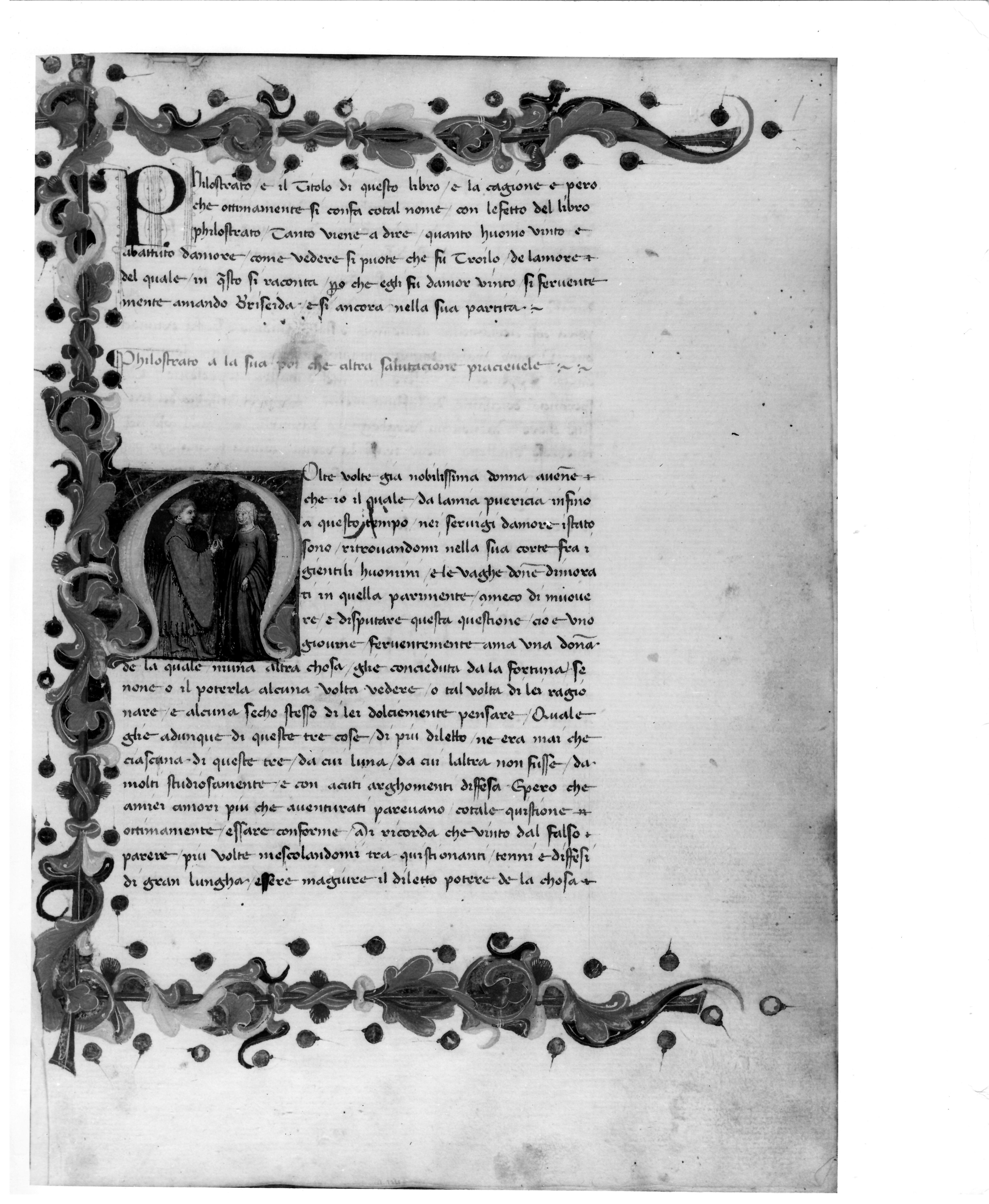 Milano, Biblioteca Ambrosiana, D 82 inf., f. 1r. Troiolo offre il proprio cuore a Criseide, all'interno dell'iniziale figurata M(olte).