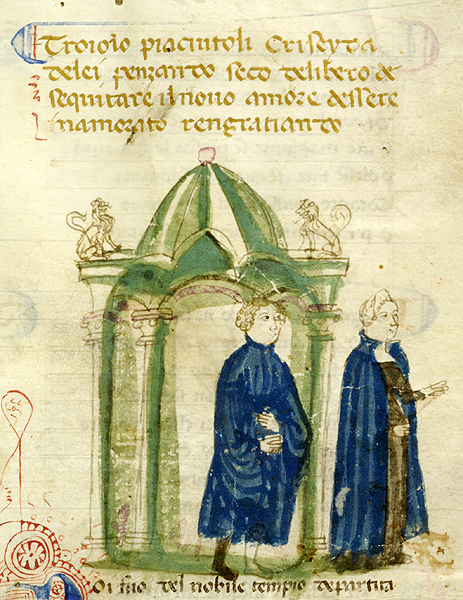 New York, Pierpont Morgan Library, M 371, f. 7r. Il copista del manoscritto, datato ottobre 1414, è Pace di Giuliano da Olibano. Troiolo segue Criseide all'uscita dal tempio.