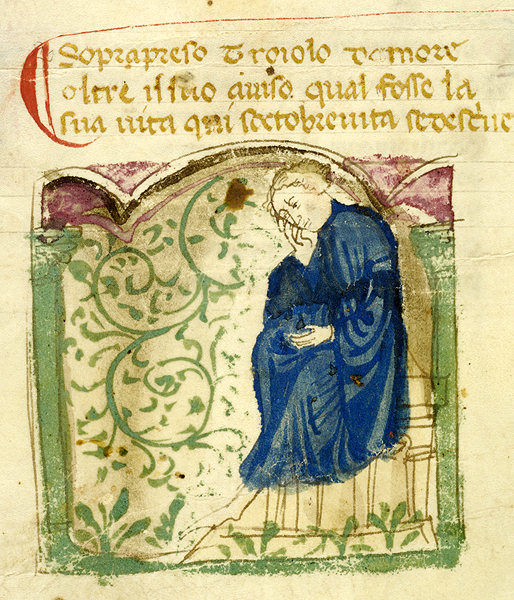 New York, Pierpont Morgan Library, M 371, f. 7v. Il copista del manoscritto, datato ottobre 1414, è Pace di Giuliano da Olibano. Troiolo siede addolorato, in preda alle sofferenze d'amore.