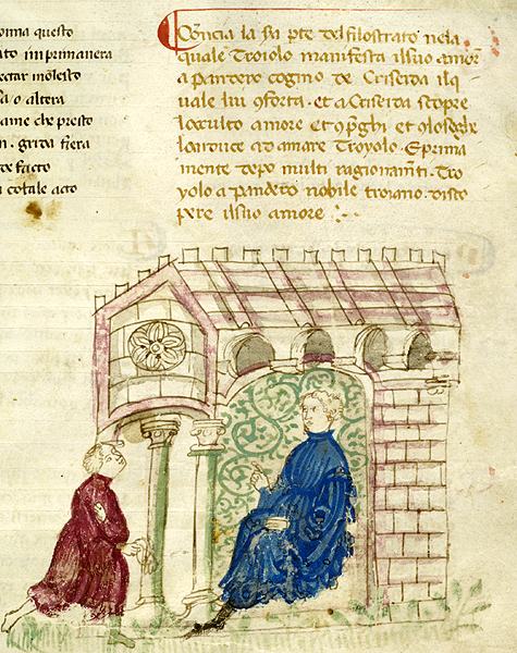 New York, Pierpont Morgan Library, M 371, f. 9r. Il copista del manoscritto, datato ottobre 1414, è Pace di Giuliano da Olibano. Pandaro si reca dall'amico Troiolo per consolarlo.