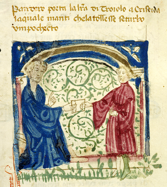 New York, Pierpont Morgan Library, M 371, f. 16v. Il copista del manoscritto, datato ottobre 1414, è Pace di Giuliano da Olibano. Troiolo consegna a Pandaro la missiva destinata a Criseide.